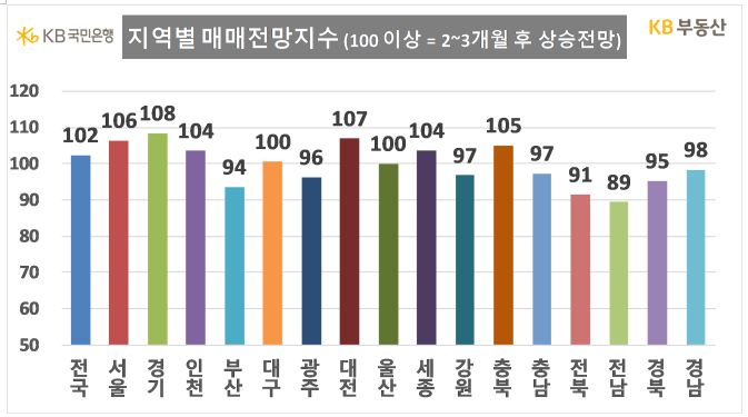 KB부동산 가격 전망지수는 전국 6,000여 중개업소를 대상으로 지역의 가격이 상승할 것인지 하락할 것인지 전망에 대한 조사를 하여 0~200 범위의 지수로 나타낸 것이다. 지수가 100을 초과(미만)할수록 ‘상승(하락)’ 비중이 높다는 것을 의미한다.