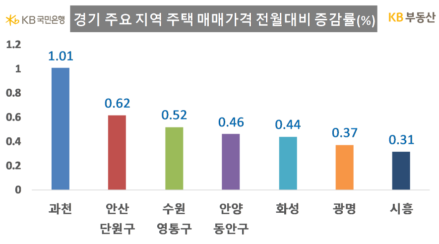 경기지역은 과천(1.01%), 안산 단원구(0.62%), 수원 영통(0.52%), 안양 동안구(0.46%), 화성(0.44%) 등은 상승했고, 고양 덕양구(-0.34%), 고양 일산동구(-0.31%), 군포(-0.28%), 고양 일산서구(-0.23%), 이천(-0.19%)등은 하락했다.