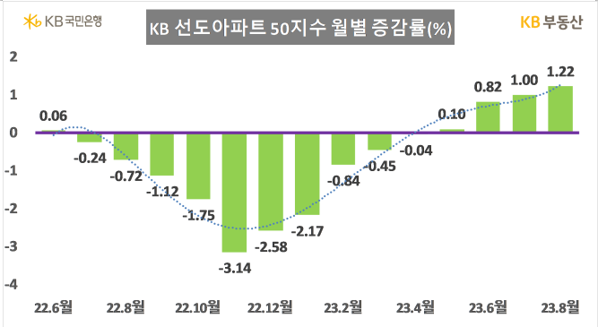 KB선도아파트 50지수는 전월대비 +1.22% 상승하였다. (-0.84%(2월) -0.45%(3월) -0.04%(4월) +0.10%(5월) +0.82%(6월) +1.0%(7월) +1.22%(8월))