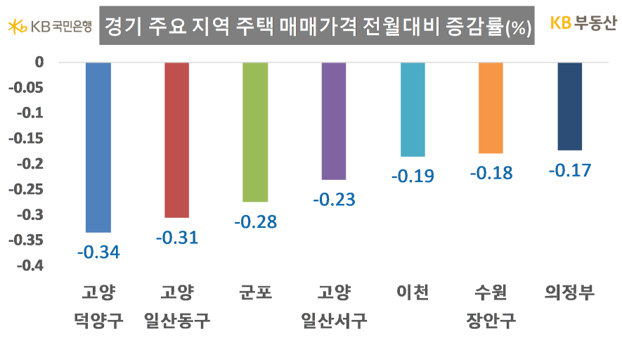 3) 경기, 인천 매매시장 : 경기는 지난달 대비 0.05% 하락, 인천은 -0.12% 하락