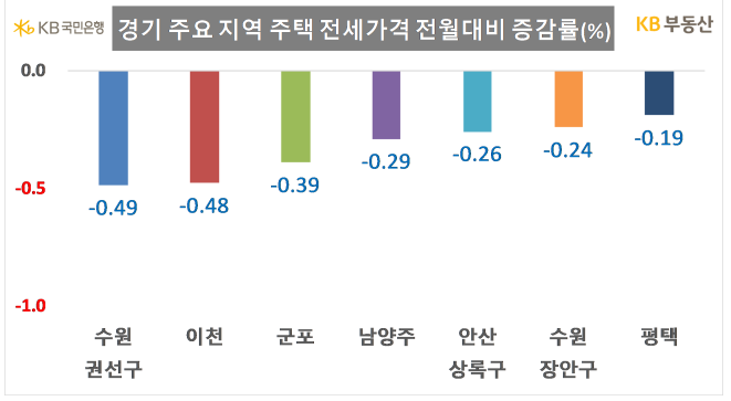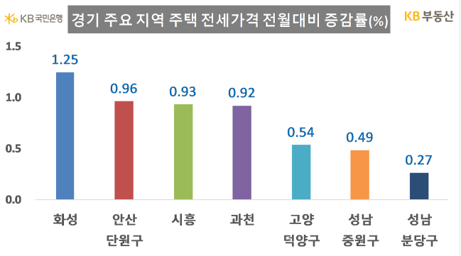 경기도는 전월 대비 0.12%의 상승을 보였다. 수원 화성(1.25%), 안산 단원구(0.96%), 시흥(0.93%), 과천(0.92%), 고양 덕양구(0.49%) 등은 상승했고, 수원 권선구(-0.49%), 이천(-0.48%), 군포(-0.39%), 남양주(-0.29%), 안산 상록구(-0.26%) 등은 하락했다.