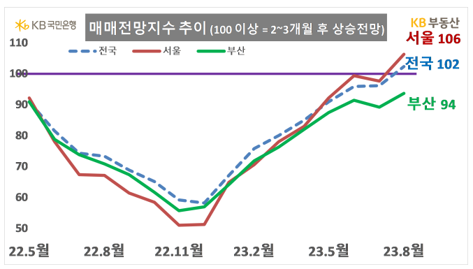 서울의 매매가격전망지수는 106을 보이며 2021년 10월 이후 줄곧 기준점인 100 아래였다가 22개월만에 100 보다 큰 수치를 보이면서 상승전망이 많아졌다.