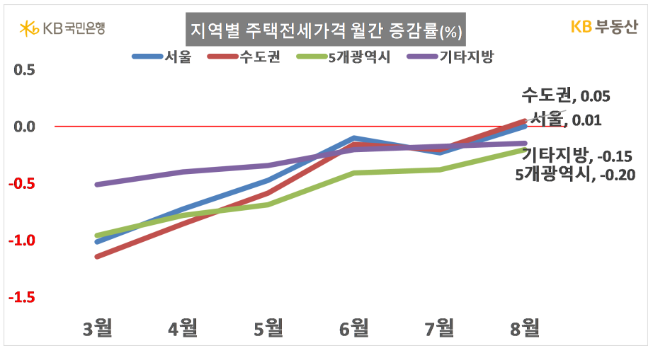 전국 주택 전세가격은 전월 대비 -0.06% 하락을 기록했다. 서울(0.01%)은 지난달 대비 소폭 상승했고, 경기(0.12%)는 지난달 대비 상승, 인천(-0.15%)도 하락, 수도권(0.05%)이 전월대비 소폭 상승했다.