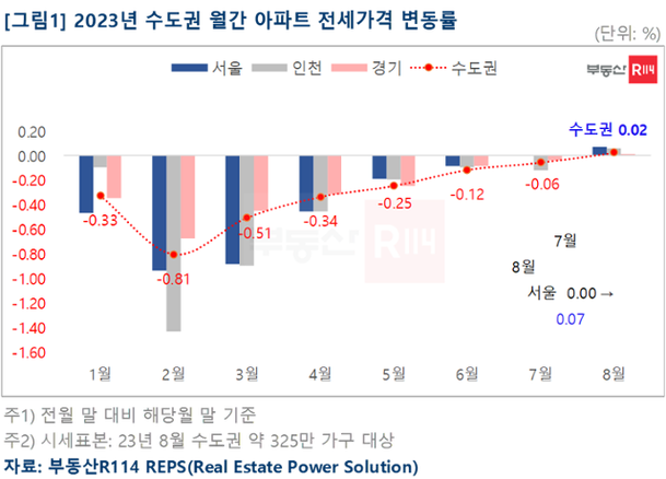 11일 부동산정보업체 부동산R114에 따르면, 지난달 수도권 전셋값 변동률은 전달(-0.06%)보다 0.08%포인트 상승한 0.02%를 기록했다. 같은 기간 서울이 0.0%에서 0.07%로, 경기와 인천은 감소세에서 각각 0.01%, 0.06%로 올랐다. 수도권 전셋값 변동률이 상승한 것은 지난해 5월 이후 처음이다.