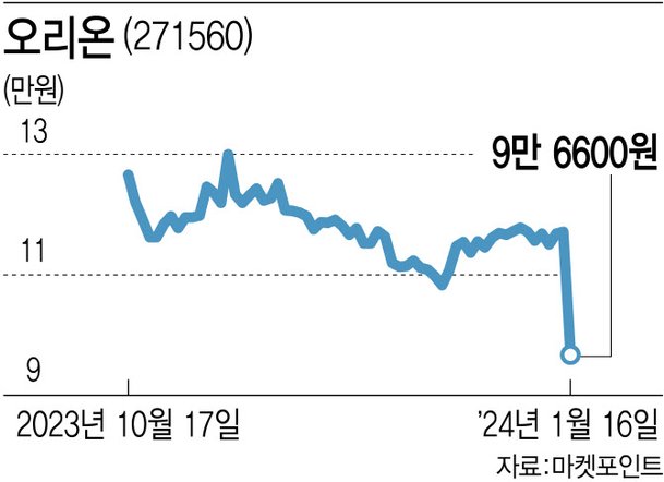 16일 오리온(271560)은 전 거래일보다 2만500원(17.51%) 내린 9만6600원에 거래를 마쳤다. 지난 2022년 9월 7일(9만4100원) 이후 처음이다. 레고켐바이오도 장 초반 상승세를 보이기도 했지만 결국 4.74% 하락한 5만2200원에 마감했다.