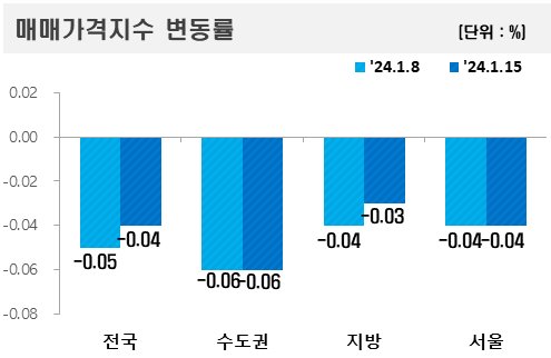 인천(-0.05%)과 경기(-0.07%) 아파트값 역시 하락하면서 수도권 전체적으로도 0.06% 내렸다. 부산(-0.06%)과 대구(-0.04%) 등 5대 광역시는 0.03%, 세종(-0.11%)과 8개도(-0.02%)에서도 하락했다. 전국 기준으로는 0.04% 내렸다.