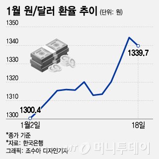 외국인의 매도세는 최근 급등 중인 환율과 관련이 깊다. 원/달러 환율은 16~17일 1320.2원에서 1344.2원으로 24원 급등했다. 이날에는 상승 출발했지만 전 거래일 대비 4.5원 내린 1339.7원에 마감했다. 환차익을 노리고 한국 증시에 베팅하는 외국인 입장에서는 환율 급등이 부담으로 작용할 수밖에 없다.