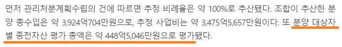 재건축, 재개발 사업이 완료된 후 새로 건설될 부동산에 대한 가치의 합계를 의미합니다. 일반적으로 종후자산평가액은 조합원들에게 분양하여 얻은 수익(조합원 분양수익)과 일반 사람들에게 분양하여 얻은 수익(일반 분양수익)을 합한 조합의 총수익 정도로 이해하면 되겠습니다.