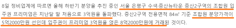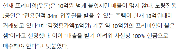 유명한 재개발지역인 한남뉴타운, 성수전략정비구역, 흑석뉴타운 등은 프리미엄이 10억원 가까이 형성되었다고 하고, 상계뉴타운, 신림뉴타운, 은평구 수색·증산뉴타운 등도 프리미엄이 3~4억원 정도가 형성되었다고 합니다.