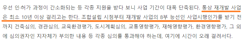일단 재개발 사업은 10년 이상이 걸리는 장기 프로젝트입니다. 재개발을 통해 새 아파트에 입주할 때까지 10여 년 이상의 기간이 소요된다고 합니다. 때문에 재개발 투자를 진행할 때 '내 돈이 10년 동안 묶이는 건가?'라는 생각이 듭니다. 하지만 반드시 '처음부터' 투자할 필요는 없고, 주요 단계(조합이 설립된 후 사업시행인가를 받은 후, 관리처분인가를 받은 후 등)에 따라 투자를 진행해도 된다고 합니다. 때문에 언론기사들을 통해 재개발 사업 관련 뉴스를 접할 때마다 '현재 재개발이 어느 정도까지 진행되었구나' 정도를 파악하고, 필요할 경우 투자를 결정해도 좋을 것 같습니다. 예를 들어 이런 식입니다.