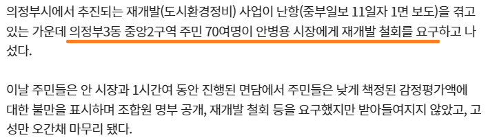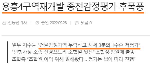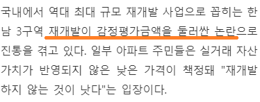 만약 조합원 A가 재개발구역에 59㎡ 빌라를 가지고 있다고 하겠습니다. 종전자산평가를 통해 해당 빌라의 감정평가를 2억 원에 받았다고 하겠습니다. 그리고 조합원 A가 받게 될 새 아파트의 조합원분양가가 5억 원이라고 한다면 조합원 A는 분담금을 3억 원(=조합원분양가 5억 원 - 감정평가 2억 원) 납부해야 합니다. 때문에 대부분의 조합원들은 분담금을 적게 납부하는 것을 원하며, 때문에 감정평가액이 높게 나오는 것을 희망하게 됩니다. 그리고 종전감정평가 결과에 만족하지 않으면 조합원들의 반발이 생기게 됩니다. 예를 들어 이런 식입니다.