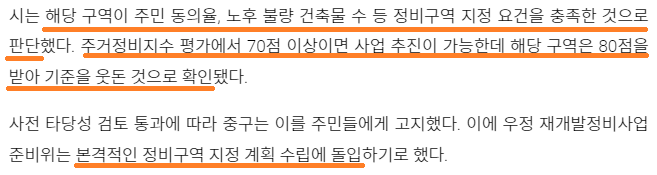 일단 특정 구역이 '정비구역'으로 지정되었다는 것은 시, 군, 구에서 해당 구역이 재개발될 필요성이 있다고 인정하는 것입니다. 하지만 정비구역으로 지정되었다고 해서 '앞으로 재개발될 것이다'라고 선뜻 투자하면 안 됩니다. 정비계획이 수립되고 정비구역으로 지정되었다고 해도 재개발이 반드시 100% 이루어진다는 보장은 없기 때문입니다. 때문에 '이 곳이 정비구역으로 지정되었구나.' 정도로만 생각하고 관심있게 지켜보면 될 것 같습니다.