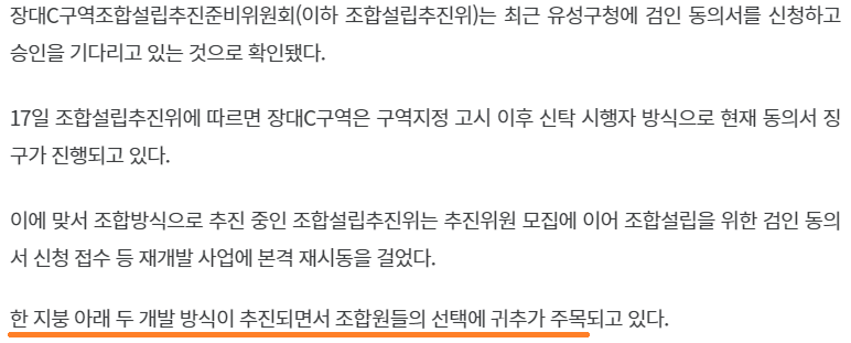 2개의 추진위원회가 조합설립을 위해 준비하고 있으며, 결국은 3/4 이상의 동의를 받은 추진위원회가 조합설립인가를 신청하게 될 것이라고 생각하면 될 것 같습니다. 하지만 3/4 이상의 동의를 받지 못하면 결국 조합설립이 무산되고, 그렇게 되면 사업 또한 무산될 확률이 매우 높습니다. 따라서 추진위원회가 구성되었다고 해서 선뜻 투자하기보다는 해당 구역에서 조합이 어떻게 설립될 것인가를 지켜보면 될 것 같습니다.