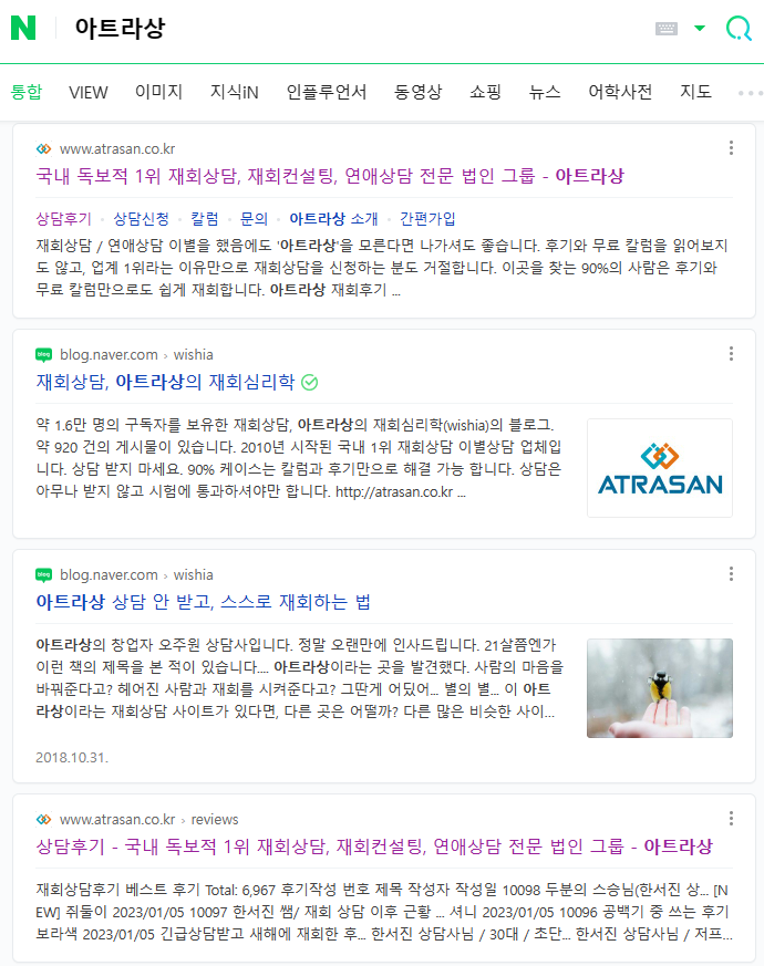 예를 들어 '아트라상'이라는 회사명입니다. 다른 사이트, 글 등이 없이 '아트라상'이라는 회사에 대한 홈페이지, 블로그, 관련 후기들, 소개글만 있으며 '다른 연관된 글'이 전혀 나오지 않습니다. 때문에 관련 후기, 칼럼, 글 등을 '깔아두기' 좋으며, 해당 회사명을 검색해서 찾아오는 고객들의 신뢰를 얻을 수 있다고 합니다.